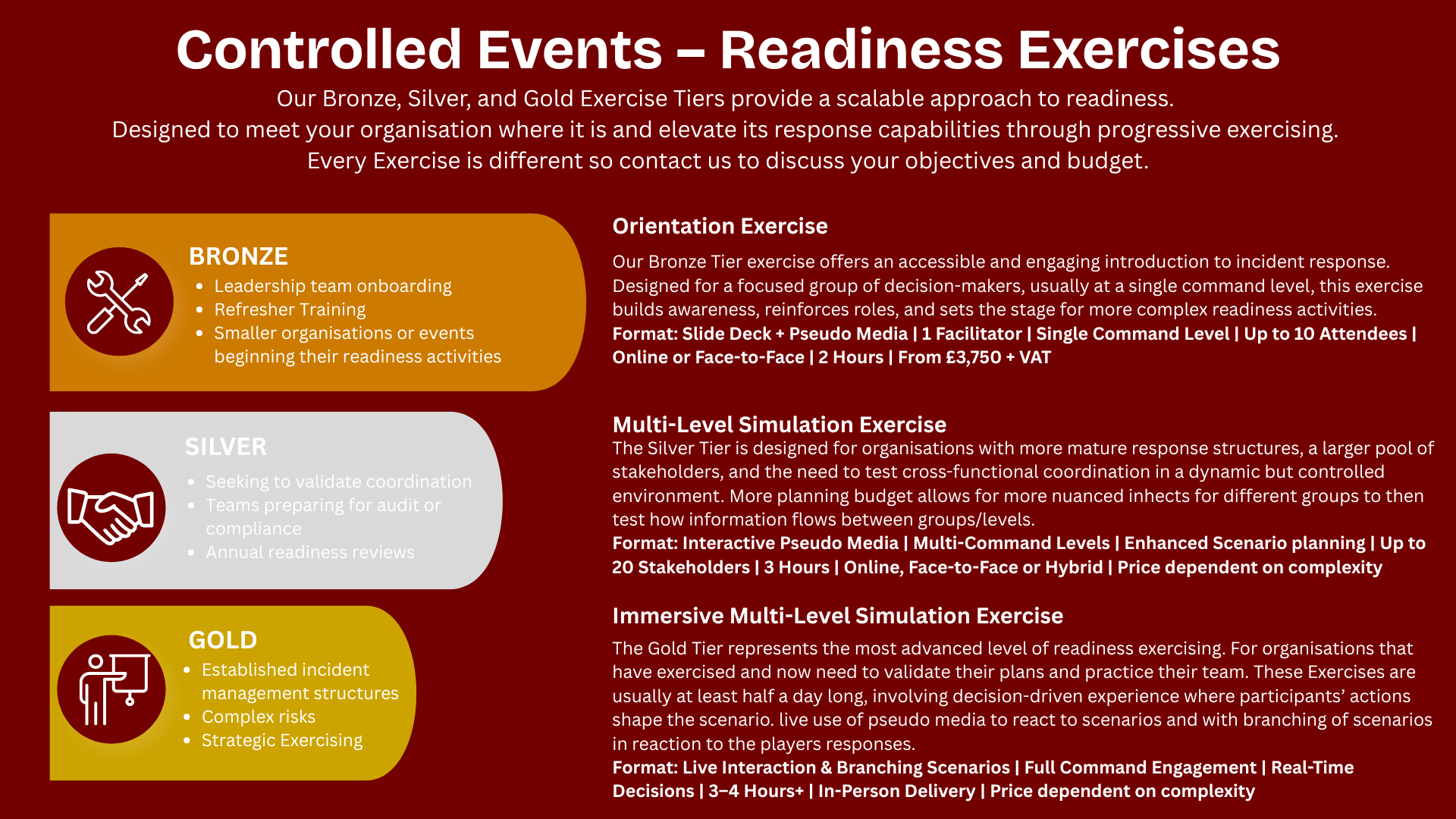 - Exercises are a significant investment and can either build or damage manager and stakeholder confidence. Off-the-shelf training often lacks relevance, offering little connection to your actual plans.
